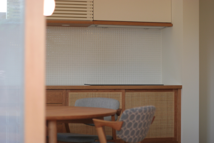 390 Living Kitchen / black cherry oil finish / rattan / sus top / teka IH / W3315 D689 H850