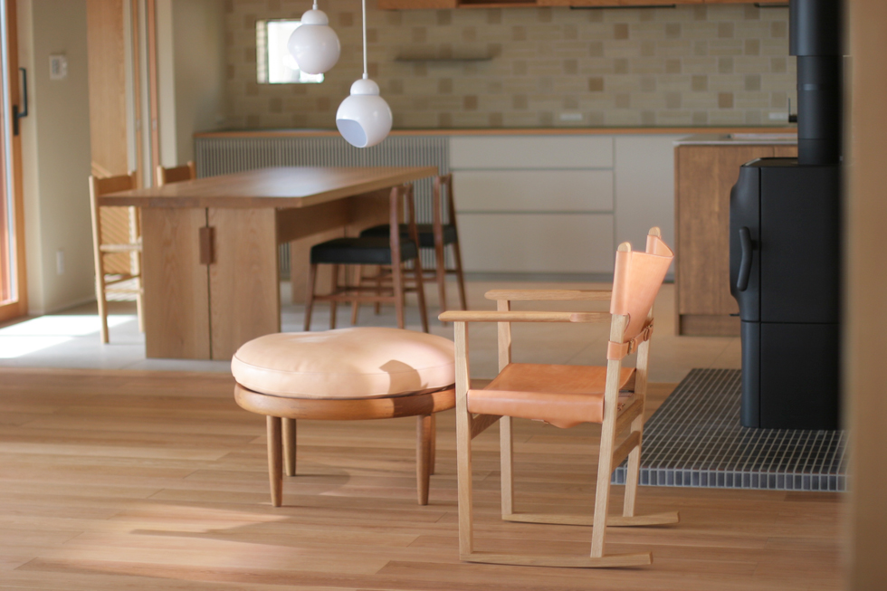 オリジナルのロッキングチェアとオットマンは薪ストーブのそばに。 L i s t